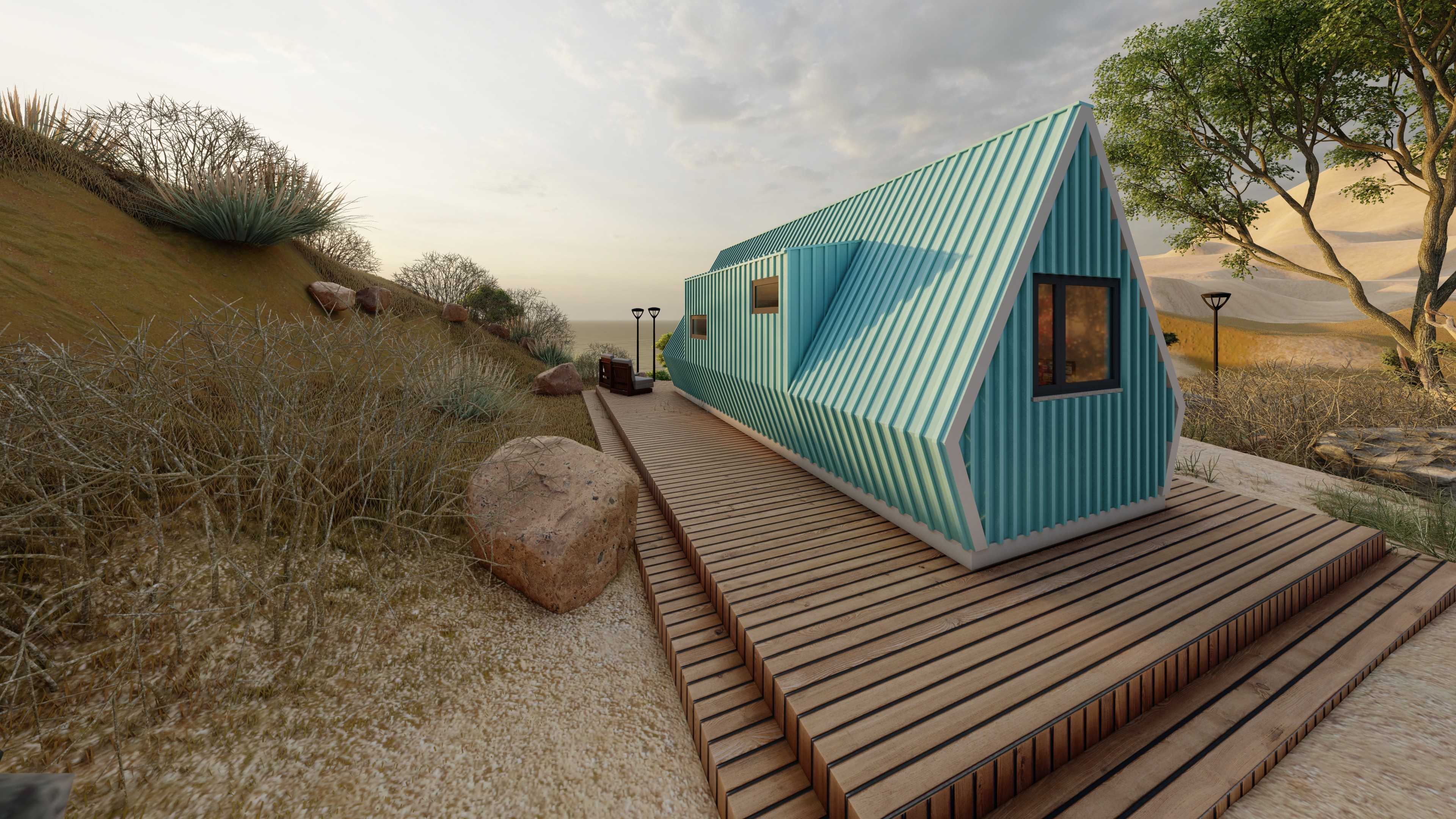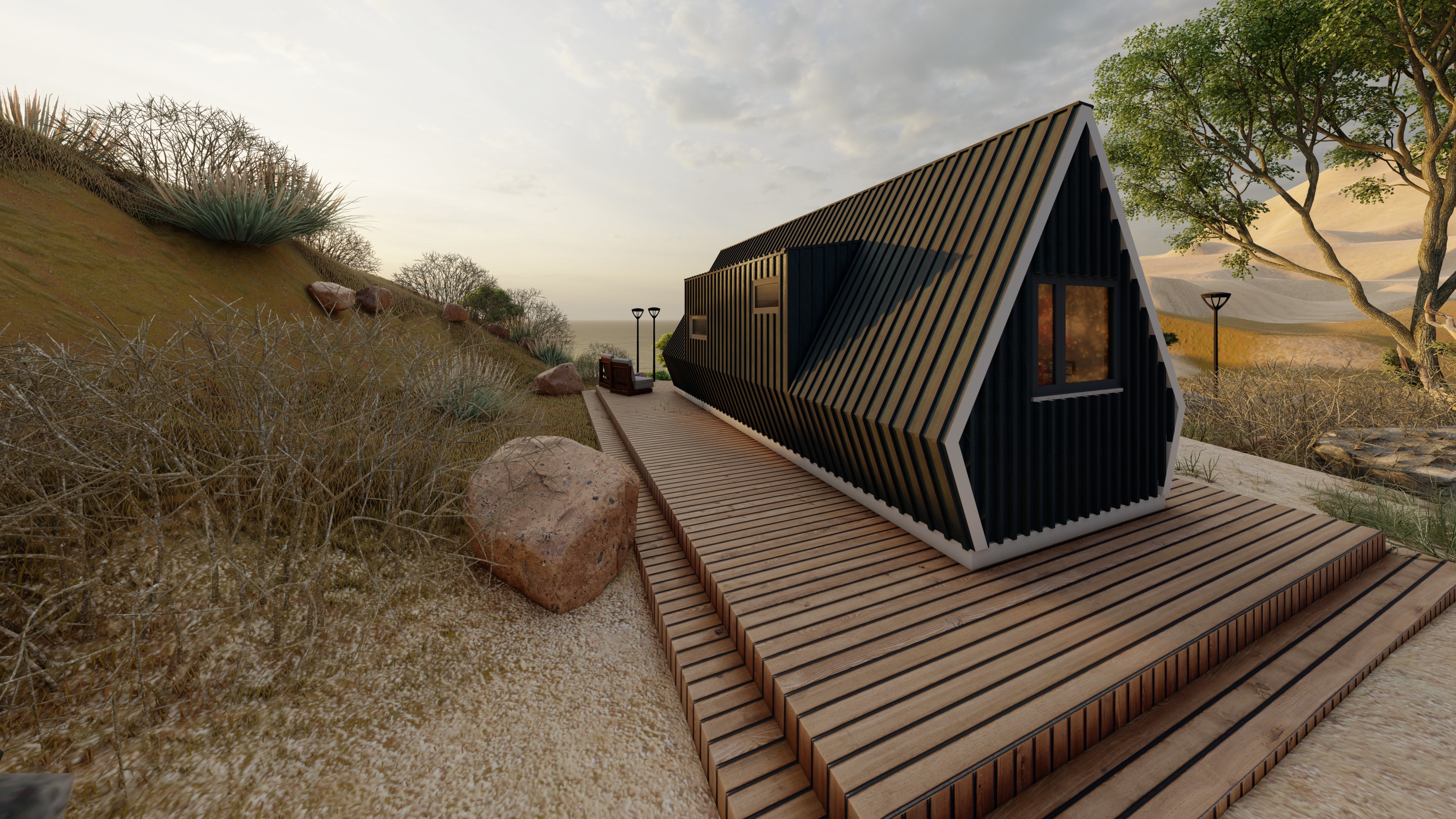 A decoração mistura madeira rústica com detalhes modernos, criando um clima íntimo e relaxante. O acabamento metálico exterior confere elegância e durabilidade, enquanto o interior moderno cria um contraste acolhedor e convidativo.