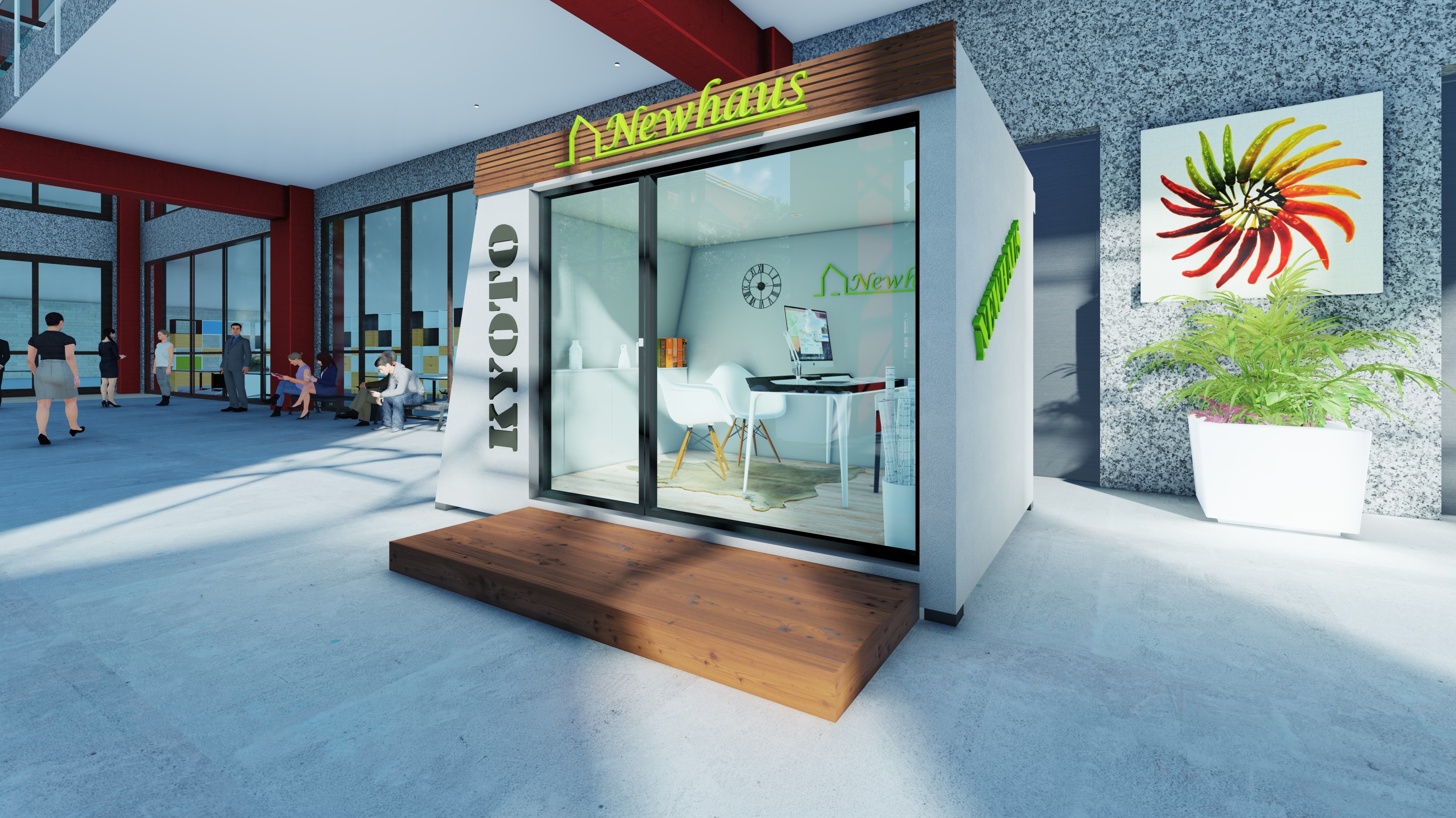 Pequeno escritório modular de design contemporâneo, com linhas retas e estrutura compacta. Possui fachada envidraçada ampla, garantindo ótima iluminação natural e sensação de amplitude. Interior funcional e de layout otimizado para aproveitar cada metro quadrado, ideal para uso profissional ou criativo.
